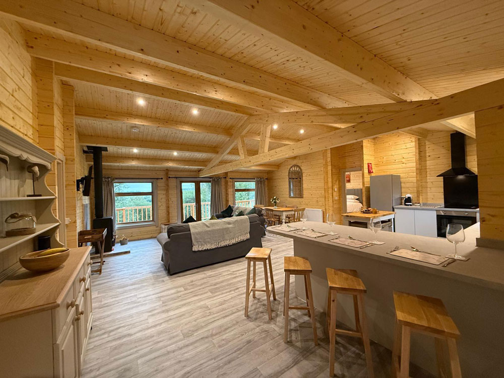 The heart of the lodge is a stylish open-plan living area with a well-equipped modern kitchen, complete with a microwave, dishwasher, fridge/freezer, coffee pod machine, air fryer, and more. The lounge offers a cosy ambiance with a wood-burning stove, Bluetooth speakers, a Smart TV with Freeview, and a DAB radio – perfect for relaxing after a day of exploring.